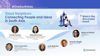 Our #OneSouthAsia conversation is a part of an ongoing bi-monthly series that explores ideas for regional cooperation in economic connectivity, climate change, and human development in South Asia. The online conversation will broadcast on the World Bank Group channels, and is a public event, which does not require pre-registration. The event is targeted toward a mixed audience including policy makers, regional influencers and stakeholders, academic institutes, civil society organizations, private sector, and the general population in South Asia.