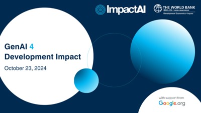 The GenAI 4 Development Impact event brought together experts from the World Bank, Google, and the public sector to discuss how generative artificial intelligence (GenAI) can promote solutions to some of the world’s most pressing challenges. Held in-person and streamed globally, this event highlighted the transformative potential of AI-powered tools, including the World Bank’s own ImpactAI, an AI-powered assistant developed by the World Bank’s Development Impact Group (DIME AI) with support from Google.org.