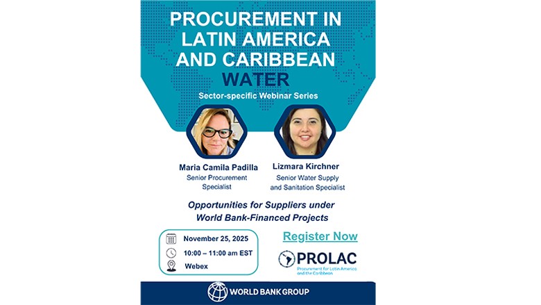 WB Procurement LAC is pleased to announce a new series of webinars focused on business opportunities in specific sectors, starting with the Water Sector. These online events will feature experts from our LAC Procurement Team and sector specialists. You will learn about the World Bank’s procurement framework, recent updates, and upcoming Business Opportunities under WB financed projects in the region. The series is open to companies worldwide interested in working in LAC.