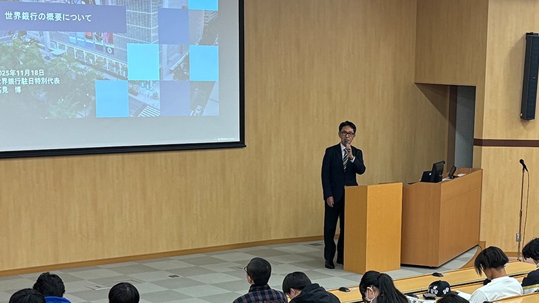 2025年11月18日、大分県の別府大学で世界銀行による講演会が開催されました。同大学の国際経営学部(阿部博光学部長)の学部生約120名を対象に、高見博 世界銀行駐日特別代表と大森功一 世界銀行東京事務所上級対外関係担当官が、世界銀行グループの概要と活動、最近の重点領域、日本と世界銀行の関係、求める人材像と日本人職員のキャリアパス事例などをご紹介しました。